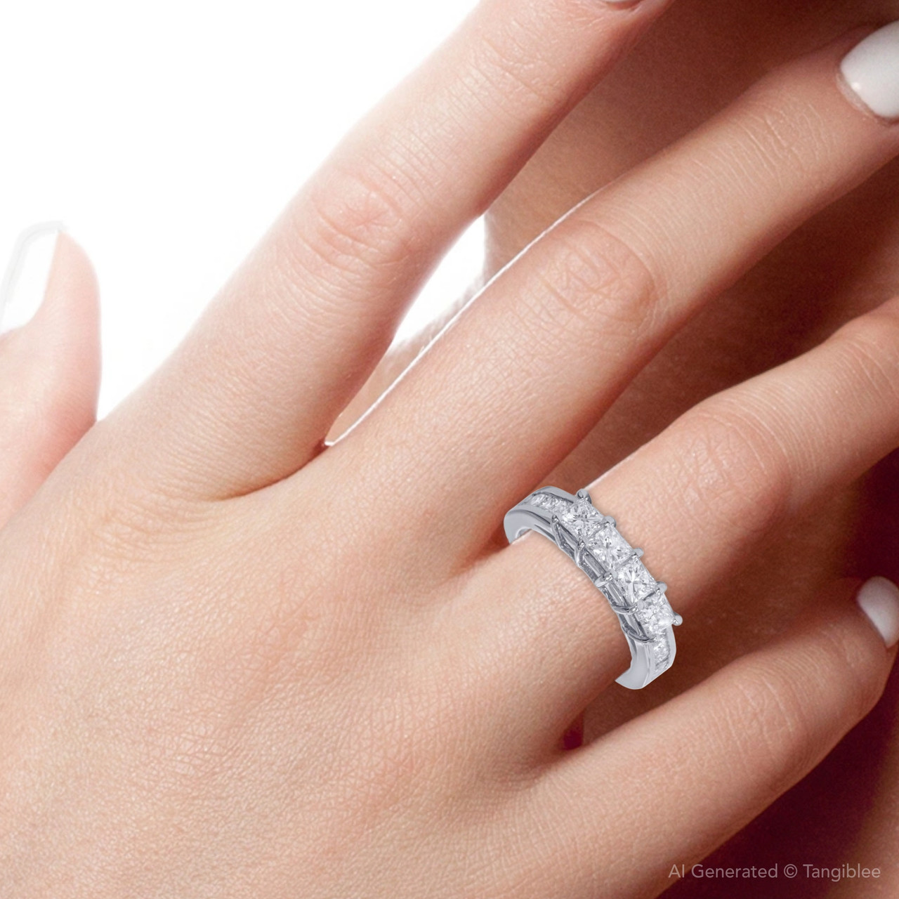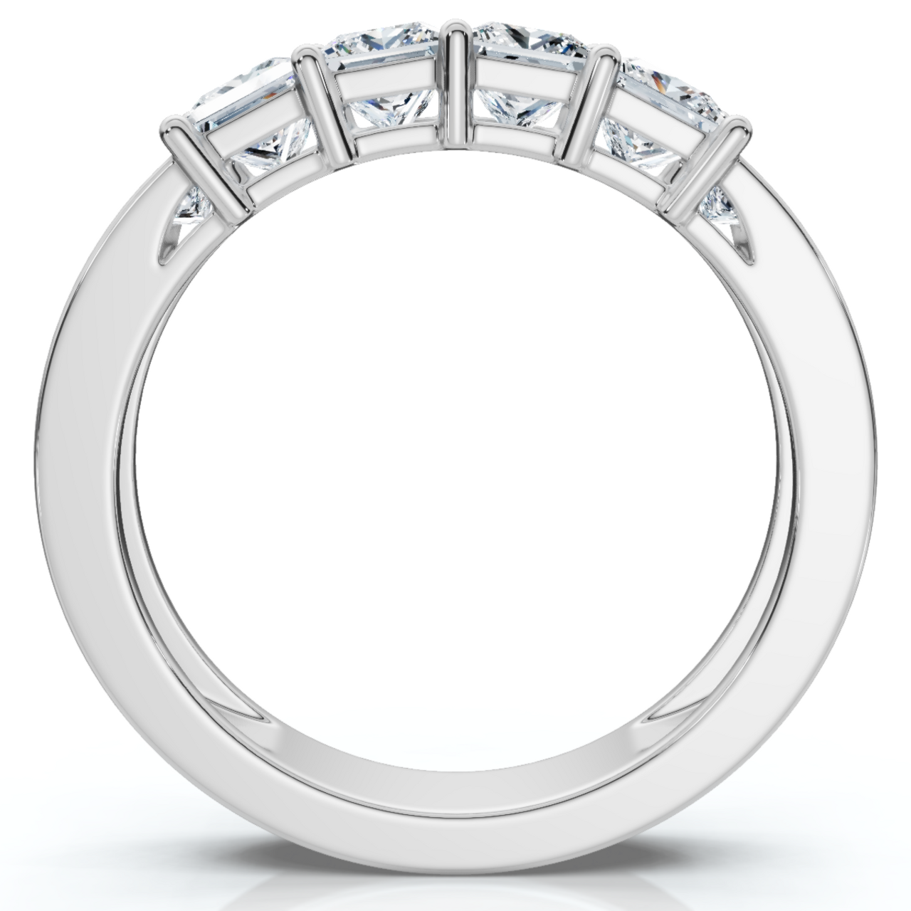 This classic womens ring features four 1/5ct princess square cut natural diamonds and eight accent diamonds down the shank. All diamonds are set in solid 14k white gold. 1 1/4ct total diamond weight.