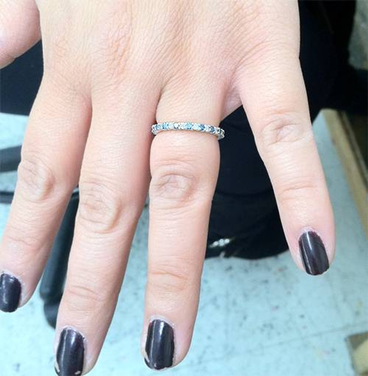 This women's ring features alternating blue and white diamonds. All diamonds are prong set in solid 14k white gold.
