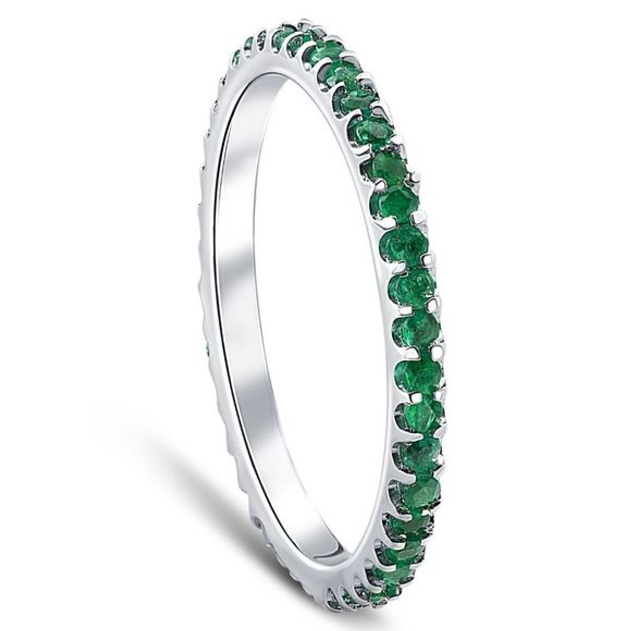 This stunning womens ring features genuine emerald gemstones that are prong set and encircle the entire ring. All stones are set in 10k white gold high polished mounting. This ring is perfect to stack with other rings for a pop of color or match with an engagement ring. Be on trend with this emerald eternity ring.