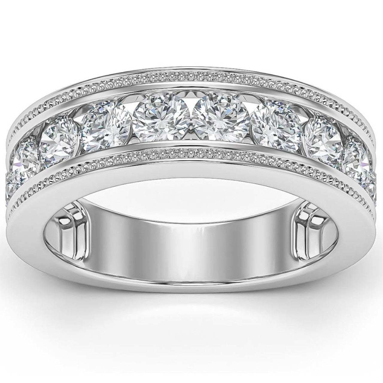 High quality men's ring features ten round brilliant cut natural diamonds. The diamonds are channel set in solid 10k white, rose, or yellow gold. The band has a polished finish.