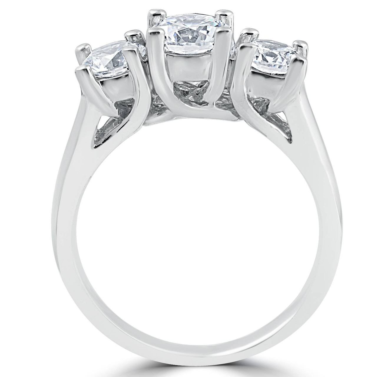 This classic three stone past present future ring contains 1 3/8ct total diamond weight. All diamonds are prong set in 14k white gold.