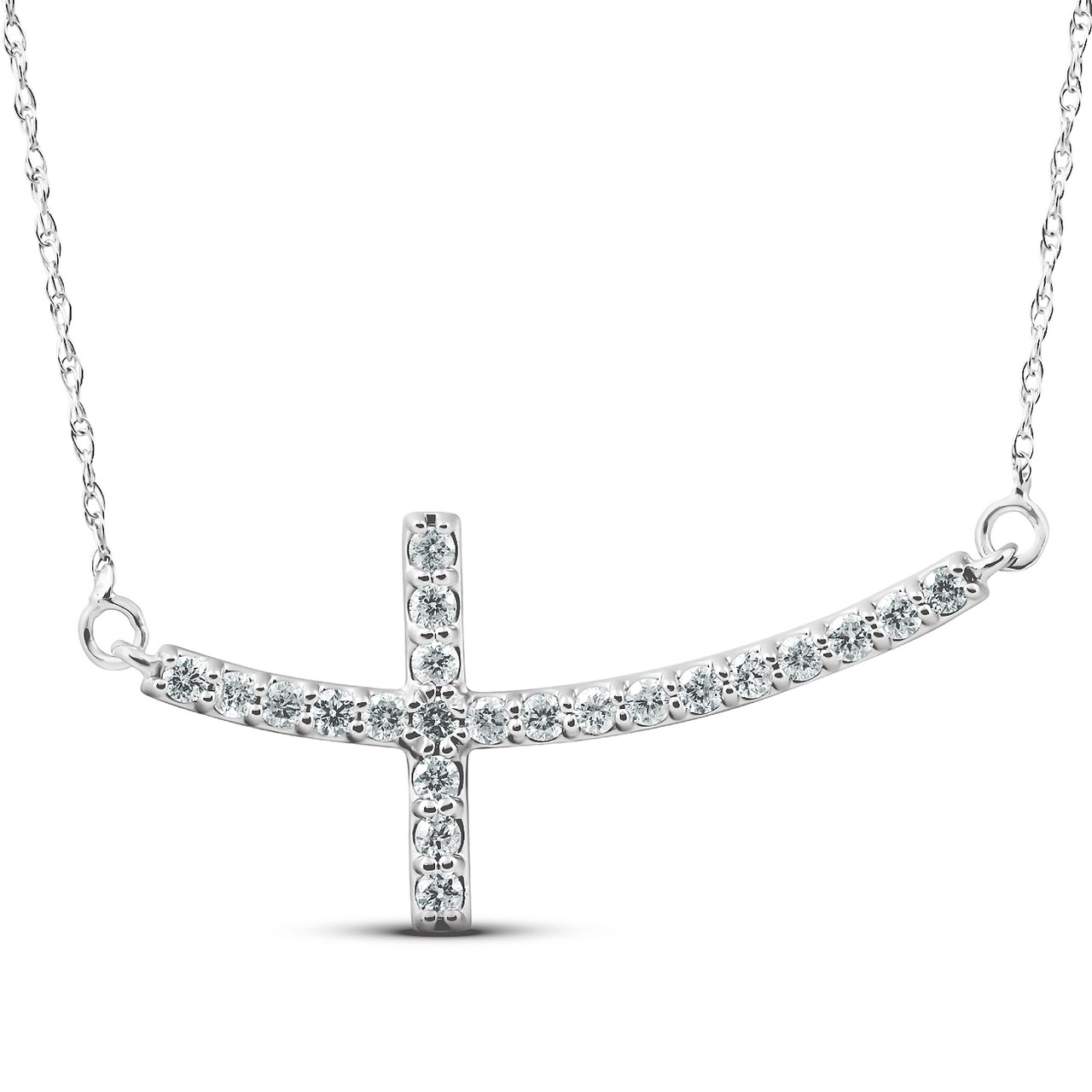 This classic cross pendant features 22 round brilliant cut natural diamonds. All diamonds are prong set in 14k white gold. An 18" 14k white gold clasp lock chain is included.