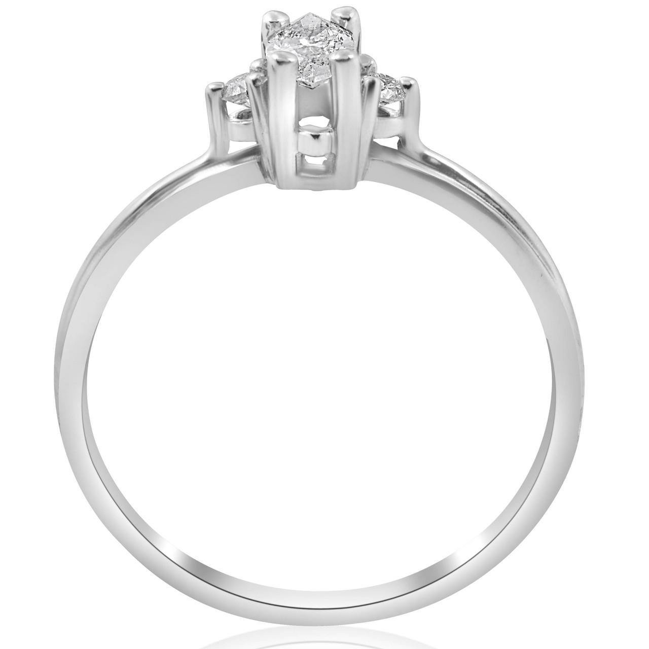 Womens ring features a 1/4carat marquise diamond and 2 round cut diamonds. All diamonds are set in solid 10k white gold.