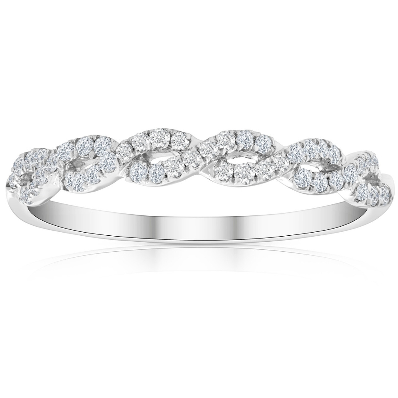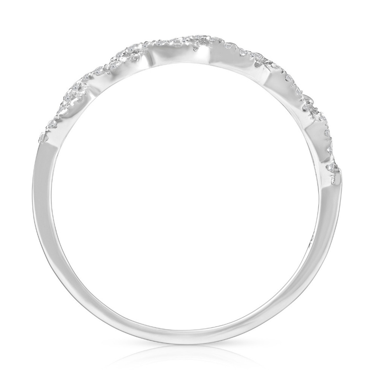 This high quality delicate womens anniversary wedding ring features 46 round cut genuine diamonds that crossover on the ring. All diamonds are prong set in solid 10k white gold high polished mounting. This ring is perfect to stack with other rings or wear alone.