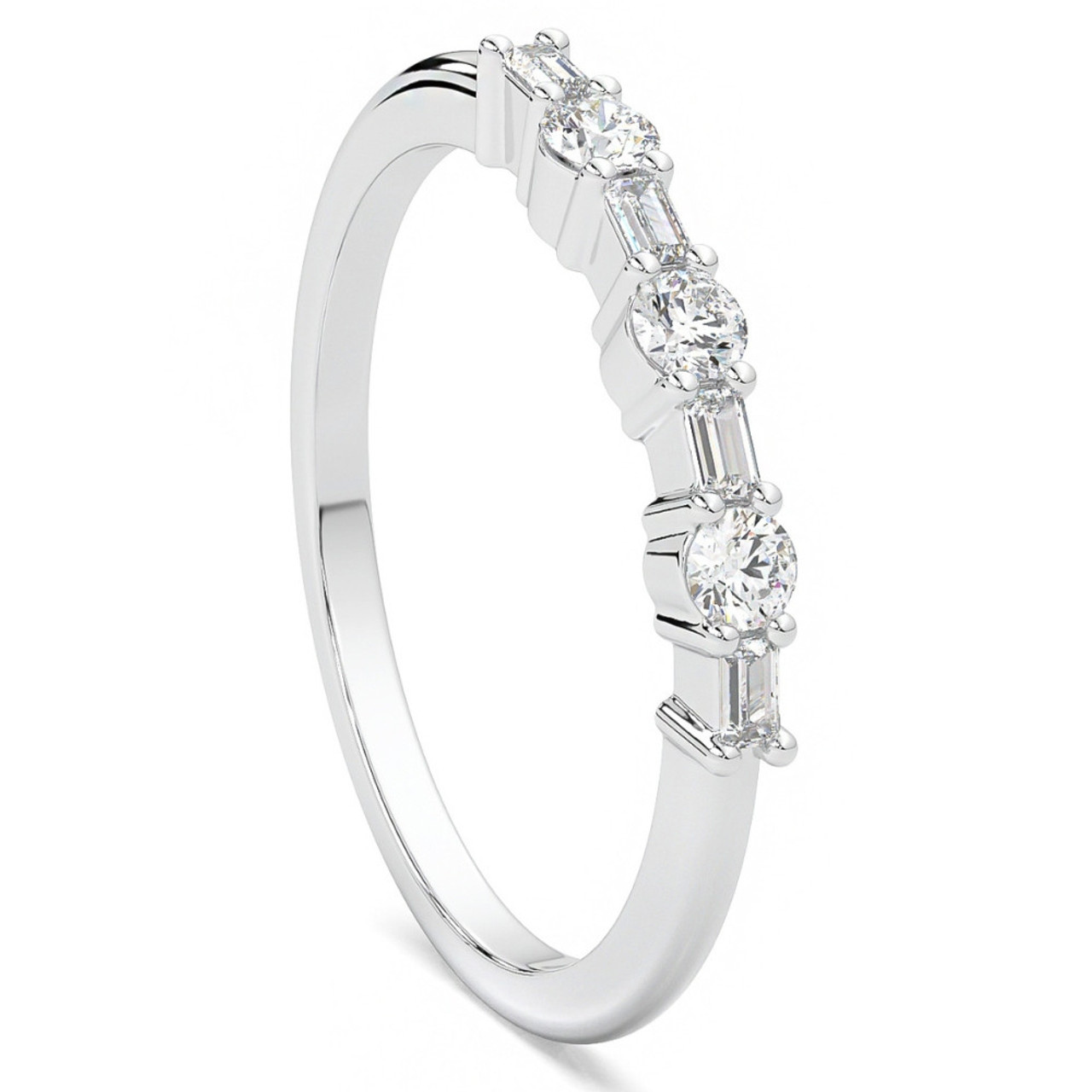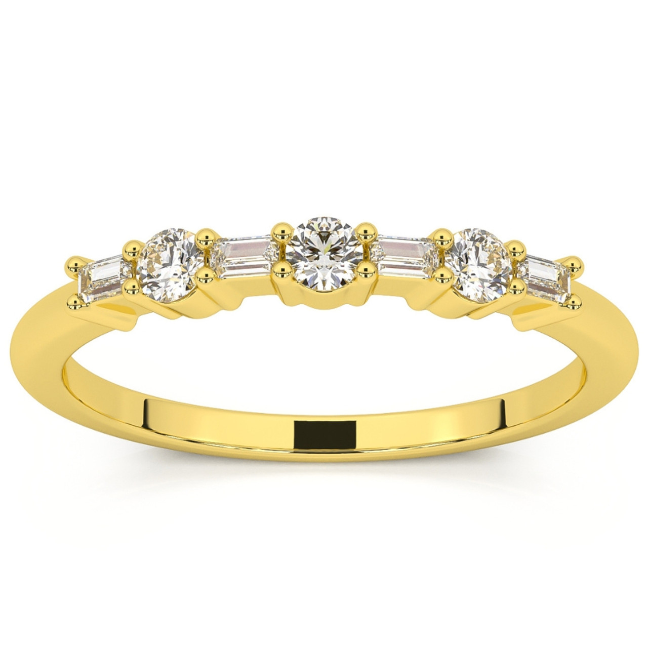 This stunning and unique women's ring features alternating round and baguette lab grown diamonds. All diamonds are set in solid polished 14k gold. This ring is perfect to accent an engagement ring or stack with other bands.