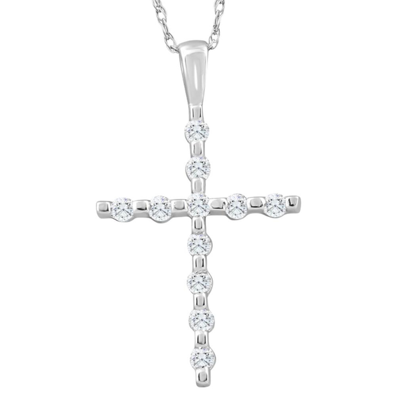 This classic cross pendant features 11 round cut natural diamonds. All diamonds are prong set in 10k white gold. An 18" 10k white gold clasp lock chain is included. 1/5ct total diamond weight. Pendant is 1" tall. 18" chain 10k white gold chain is included.
