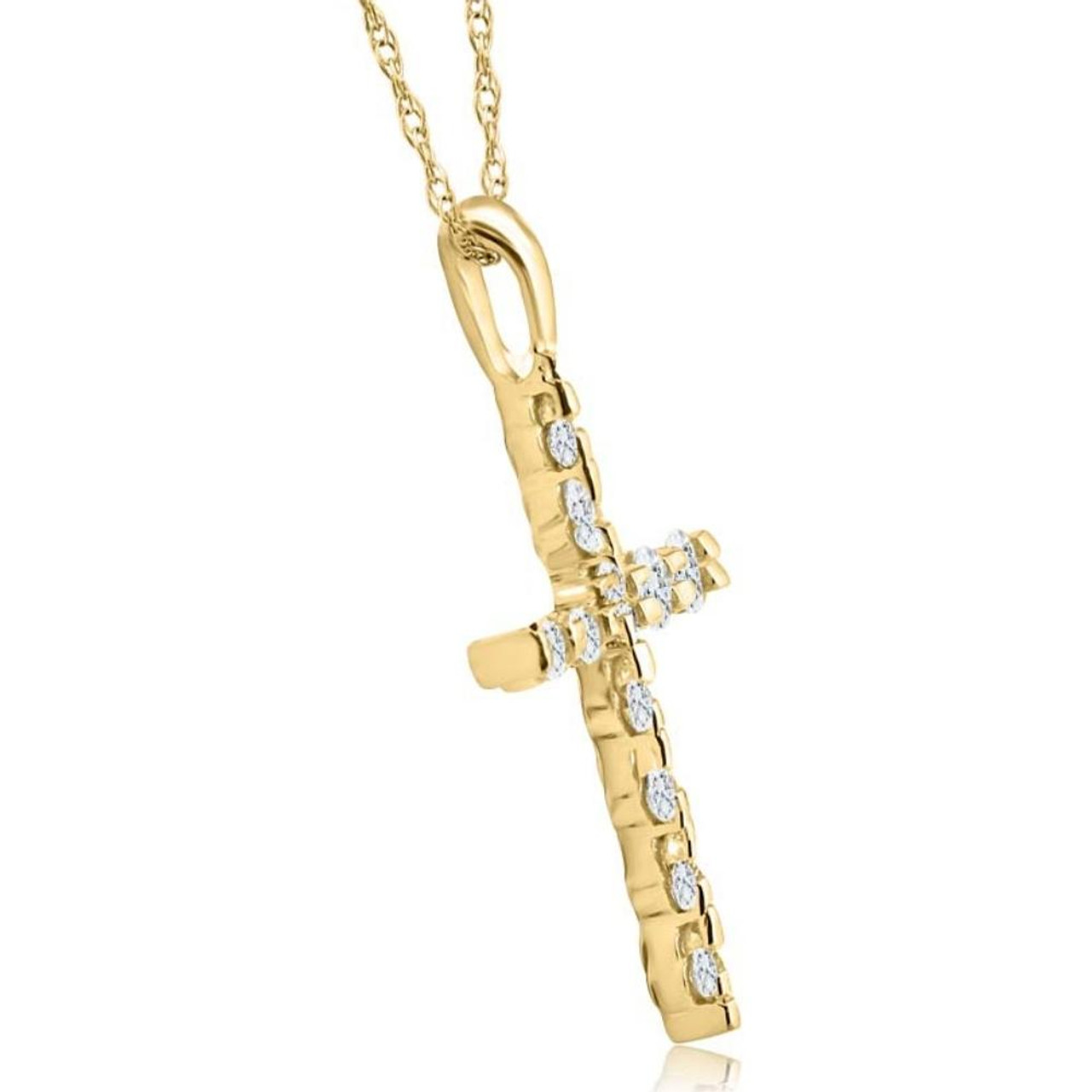 This classic cross pendant features 11 round cut natural diamonds. All diamonds are prong set in 10k yellow gold. An 18" 10k yellow gold clasp lock chain is included. 1/5ct total diamond weight. Pendant is 1" tall. 18" chain 10k yellow gold chain is included.