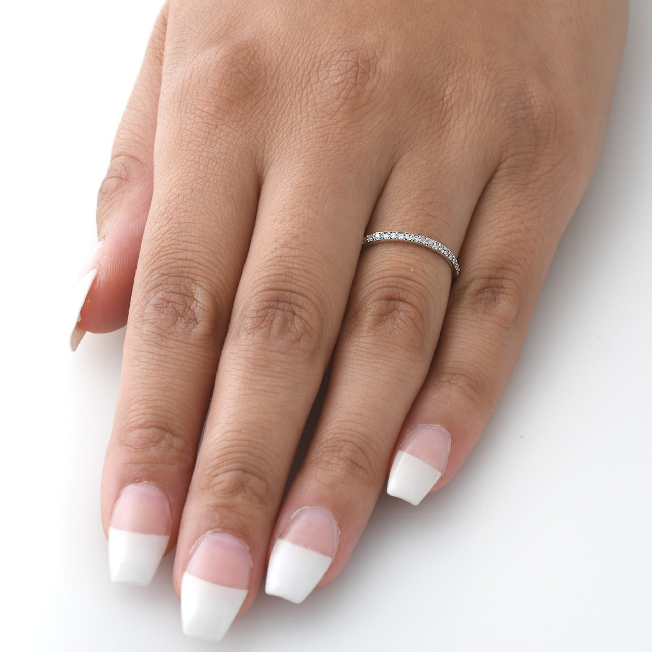 White gold wedding rings have been the trend for years and continue to be popular. The cool tone of the metal makes a fantastic match with the bevy of diamonds on the piece. The diamond stackable wedding ring is made of 10 karat white gold, which gives durability and strength along with its serene beauty. You can learn more about about this ring at our jewelry education page.