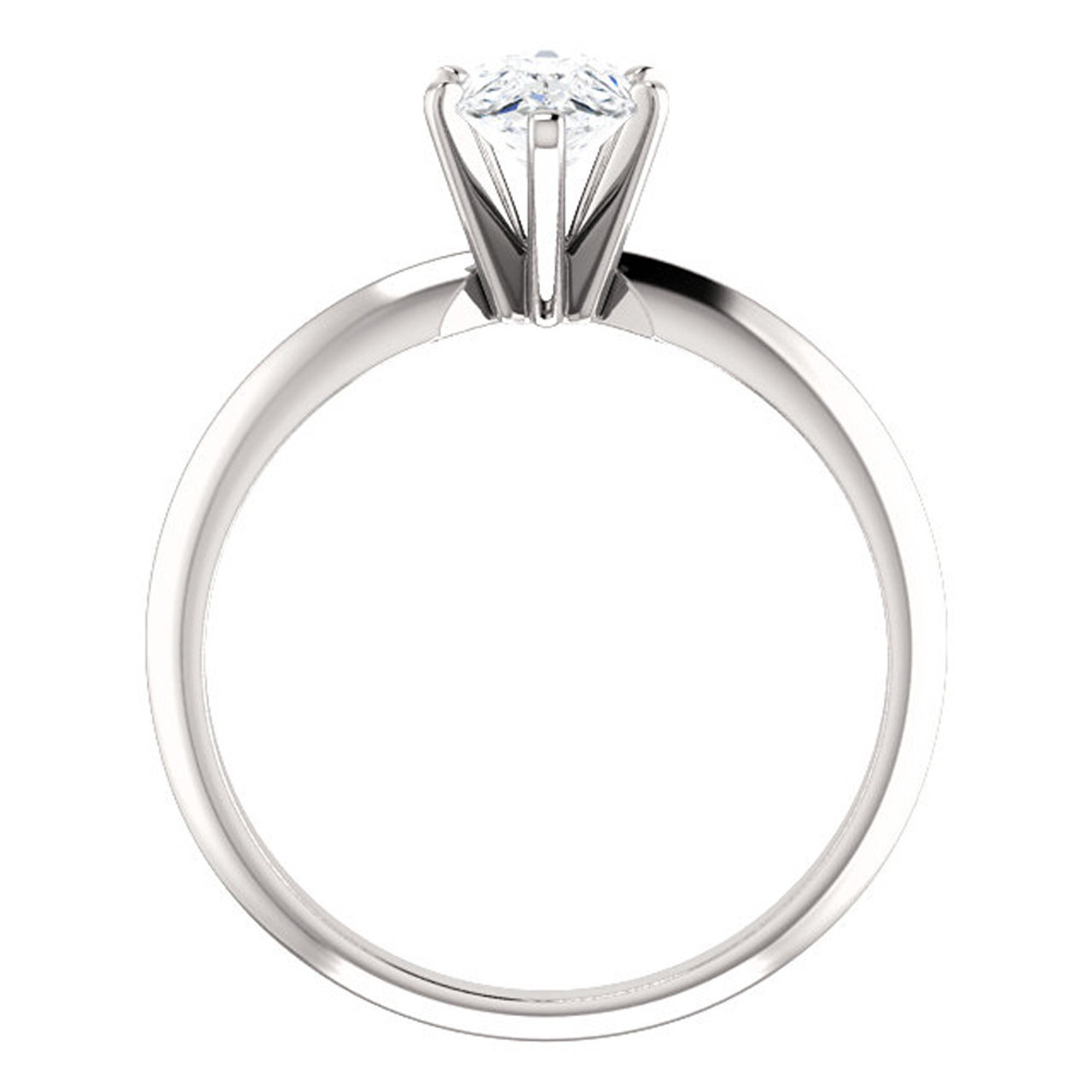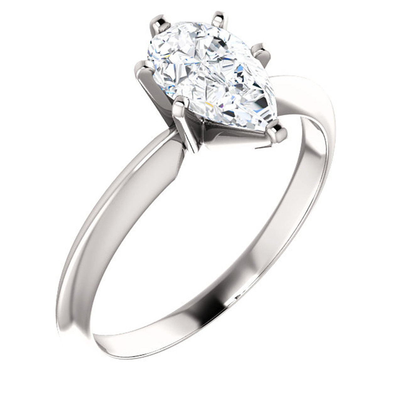 This high quality women's engagement ring features one genuine pear shape lab grown diamond. The pear shape diamond is 6-prong set in solid 14k white gold high polished mounting.