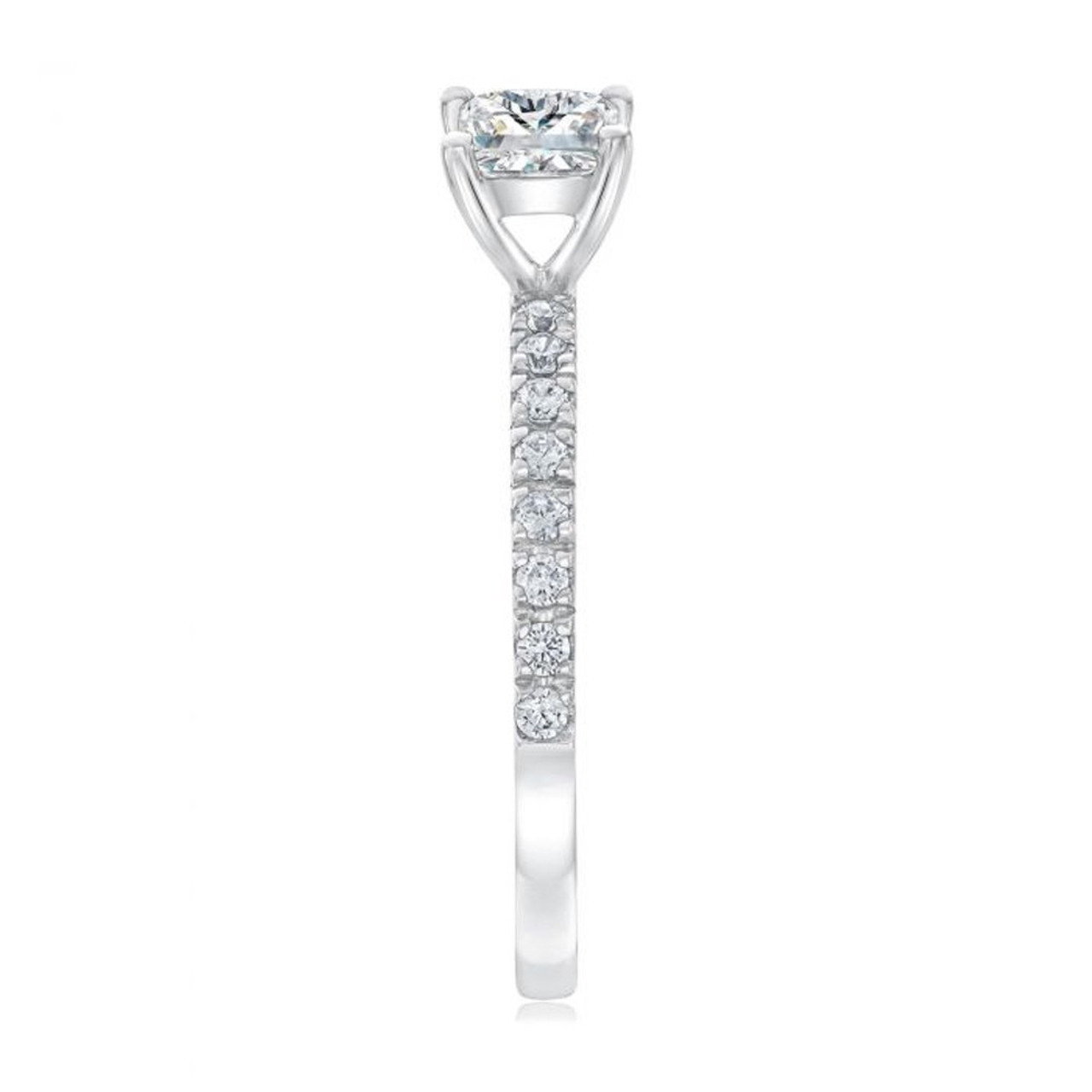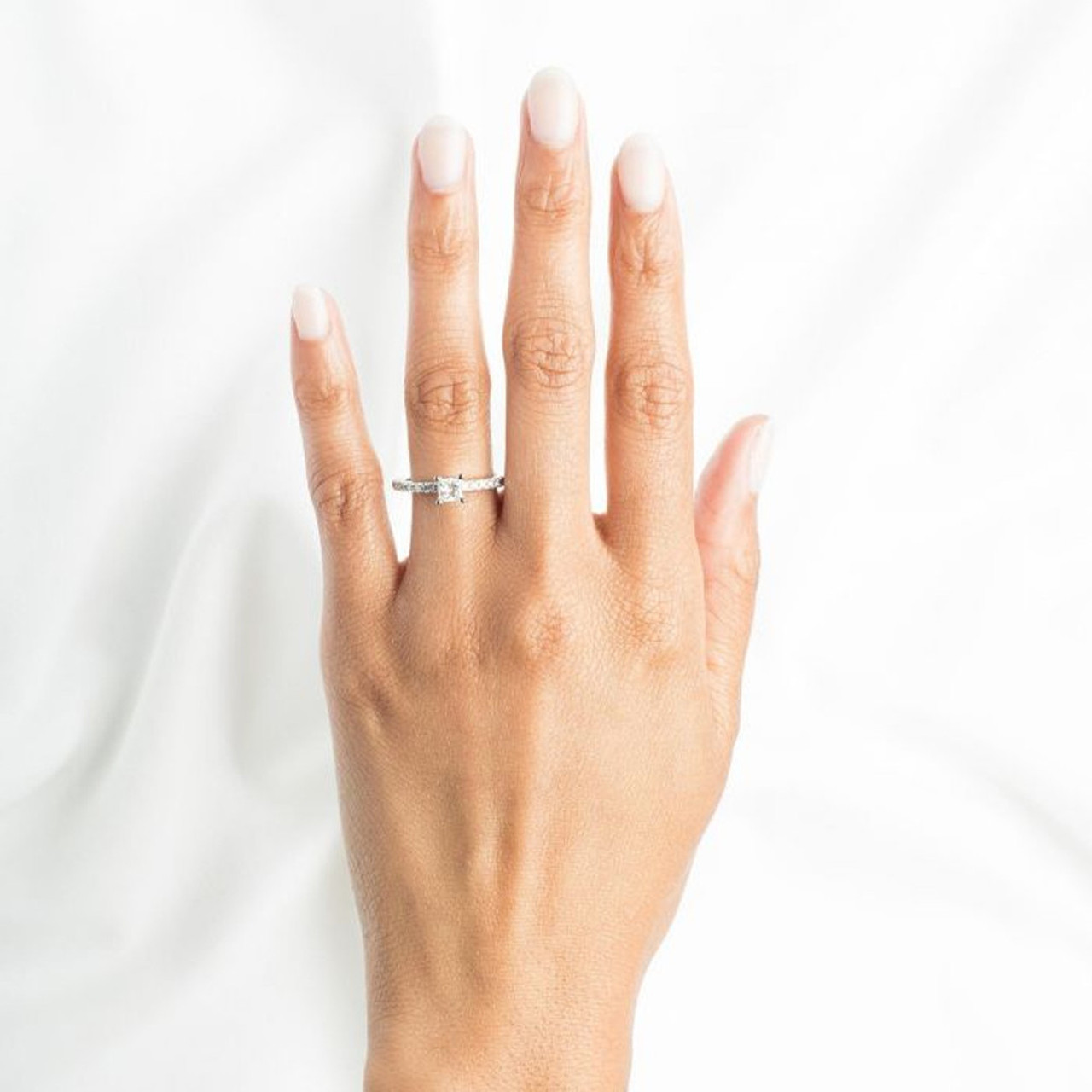 This classic women's engagement ring features a 3/4ct princess square cut lab grown diamond and 18 round cut lab grown accent diamonds. All stones are set in solid white gold high polished durable delicate mounting.
