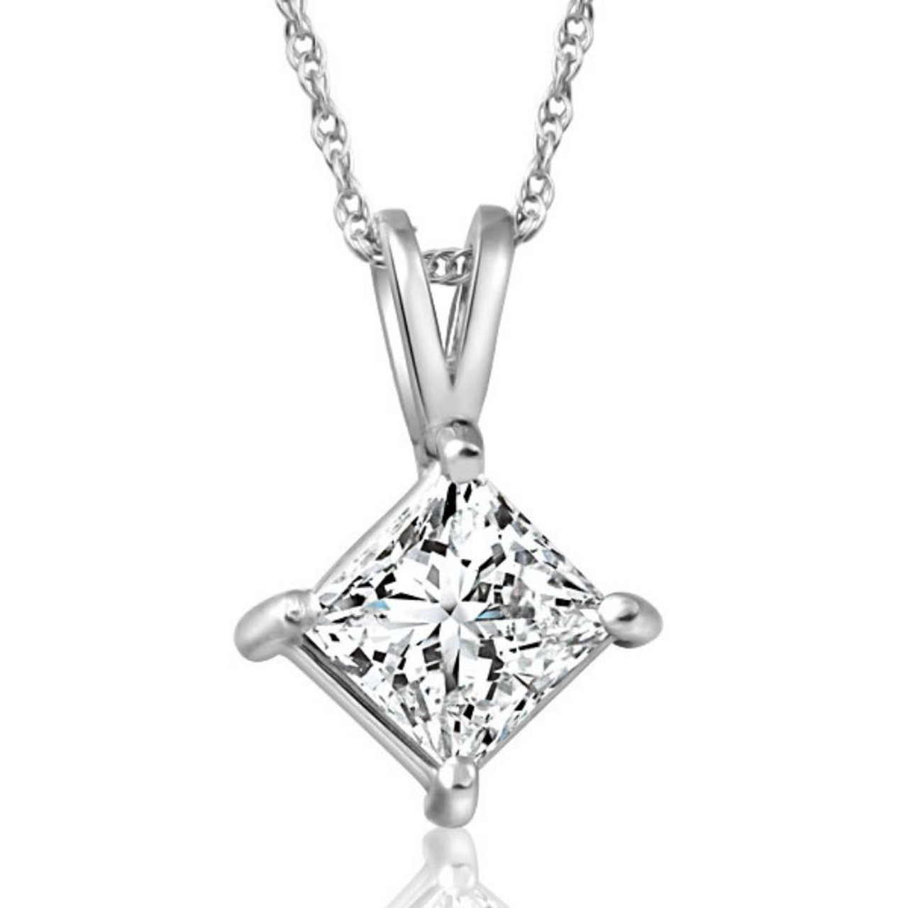 This classic women's solitaire pendant features one princess square cut lab grown diamond. The diamond is prong set in solid white gold. An 18" 14k white gold clasp lock chain is included.