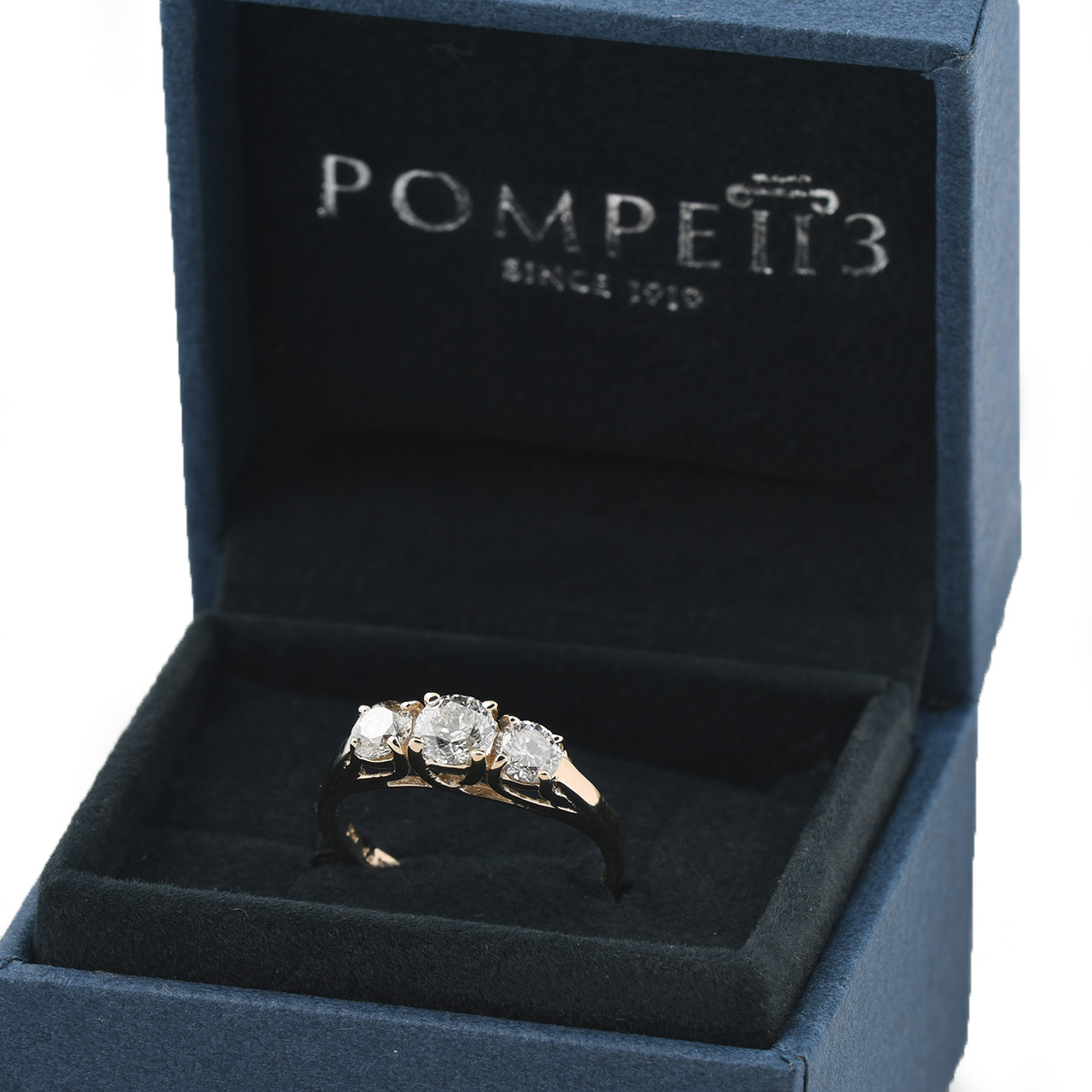 This classic and stylish womens ring features three round brilliant cut genuine diamonds. The diamonds are prong set in solid 14k yellow gold high polished three stone mounting.