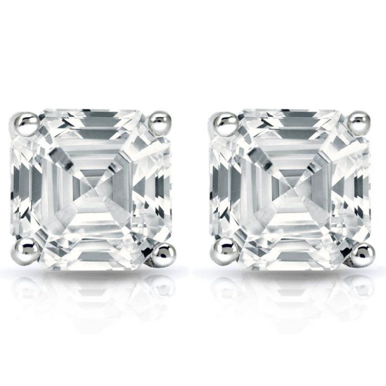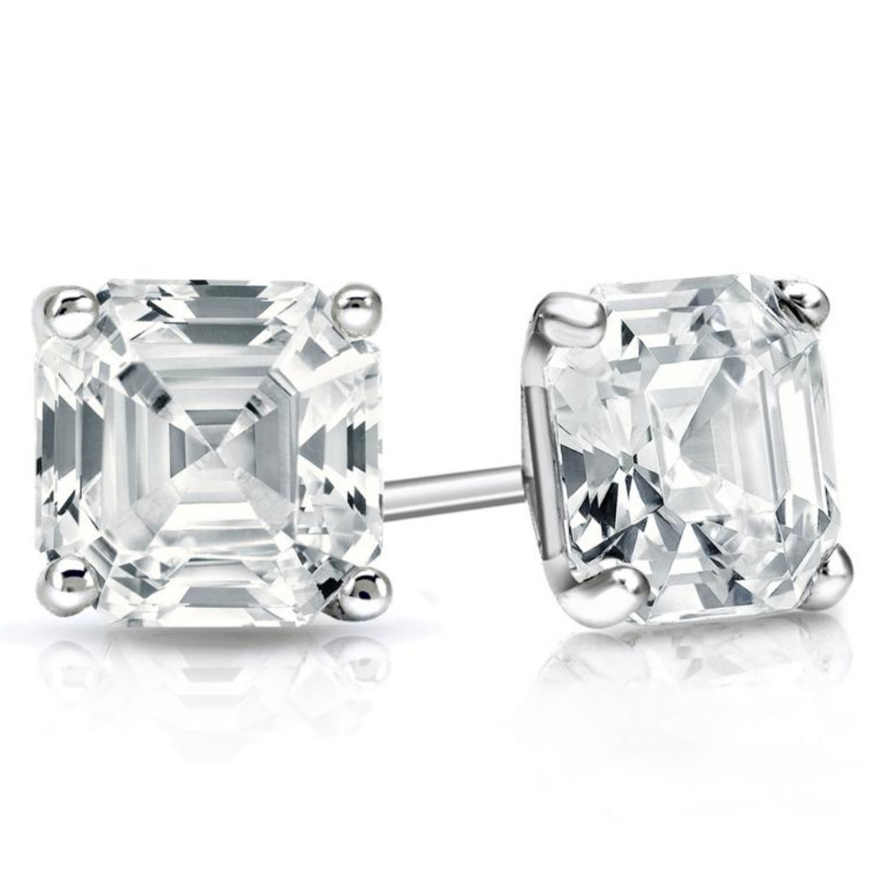 Womens matching pair of stud earrings features two asscher cut lab grown IGI certified diamonds. Both diamonds are prong set in solid 14k white gold push backs.