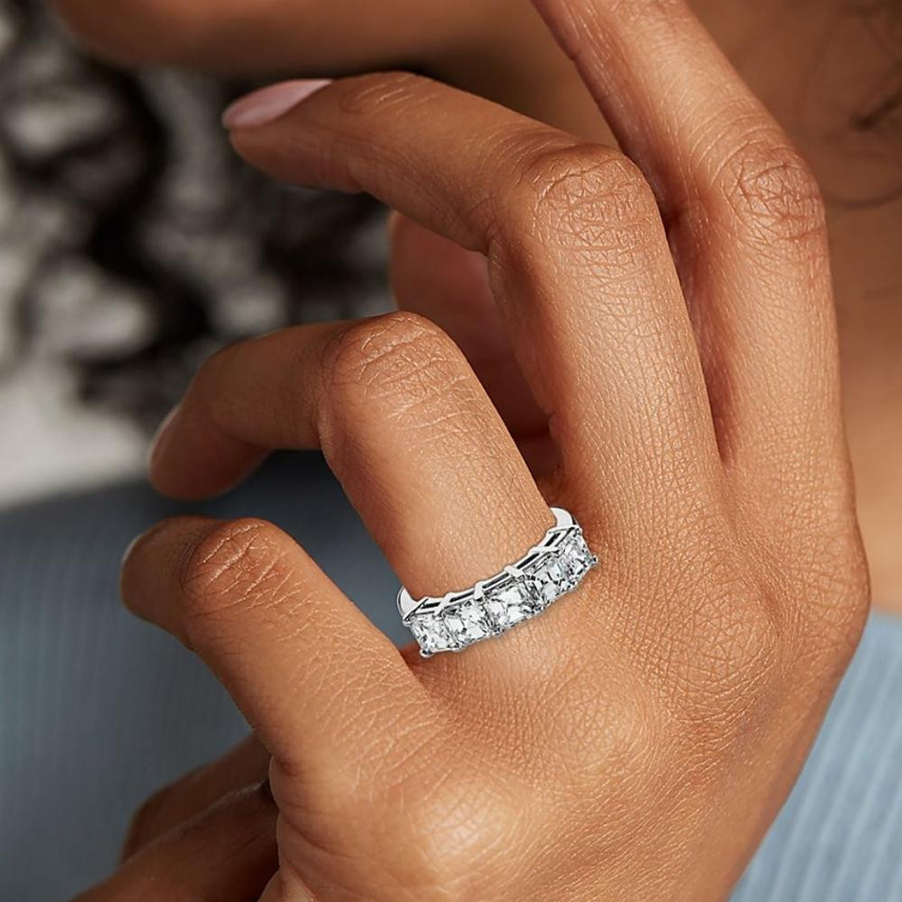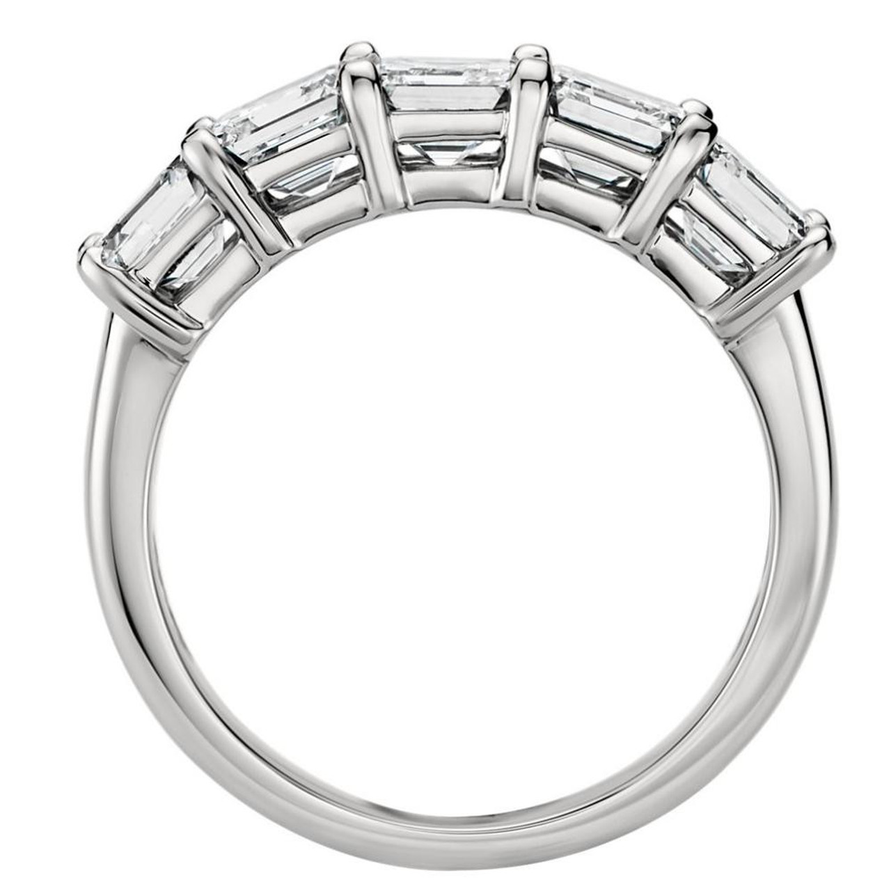 Women's ring features five genuine moissanite asscher cut diamonds. All stones are prong set in solid cast polished 14k gold. The fashionable band is made of solid 14k gold and durable to wear every day or stack with another band.
