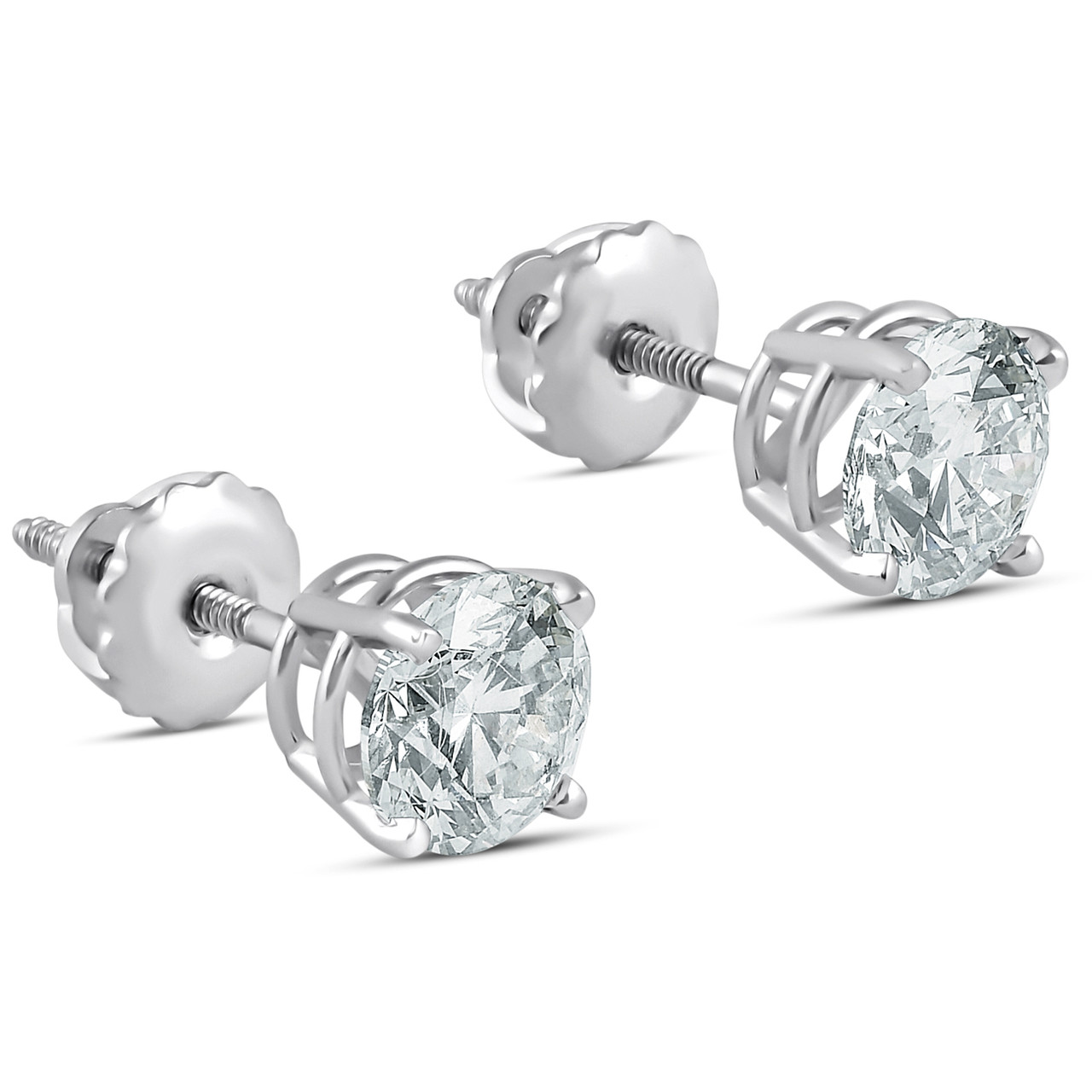 This classic matching pair of studs features 2 round brilliant cut moissanite stones. Both stones are prong set in solid 14k white gold findings. Each earring is secured by 14k white gold screw backs.