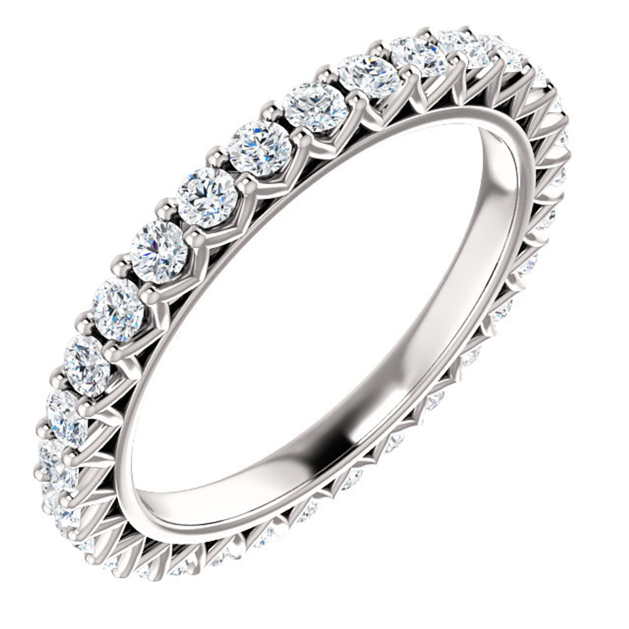 Womens ring features round brilliant cut genuine diamonds. All diamonds are v prong set in solid 14k white gold high polished mounting. The diamonds encircle the entire ring and would compliment other rings or be stunning worn alone.