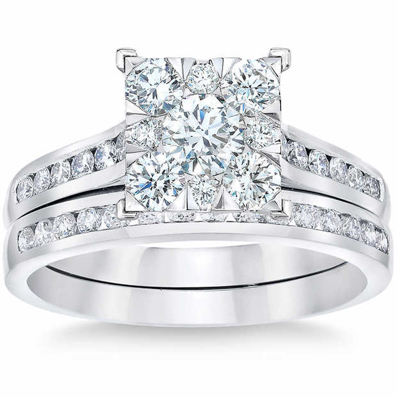 Stunning and classic women's engagement ring features 36 round cut genuine diamonds. The side stones are channel set and main top is prong bead set. The arrangement of the center gives this a big look and has a lot of wow factor. Matching wedding ring is included and all diamonds are set in solid white gold.