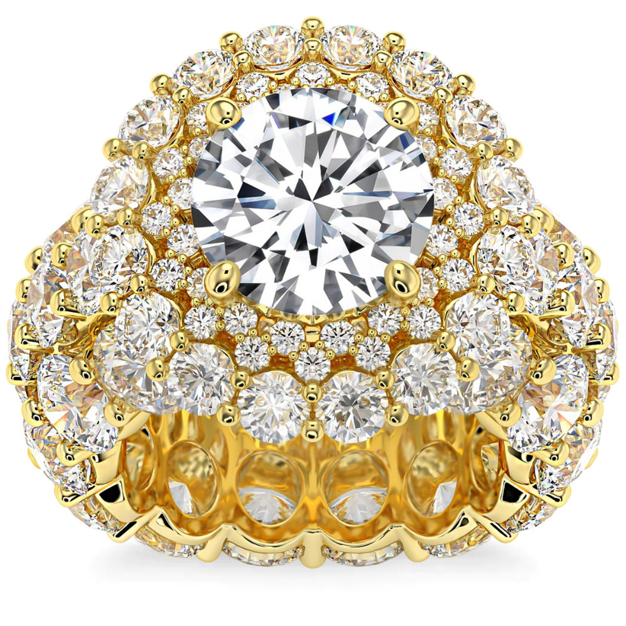 This high quality women's engagement ring features a 4 Ct 10mm round brilliant cut moissanite and 92 round cut accent diamonds. The stones are prong set in a solid 14k gold high polished mounting. The diamonds encircle the ring.