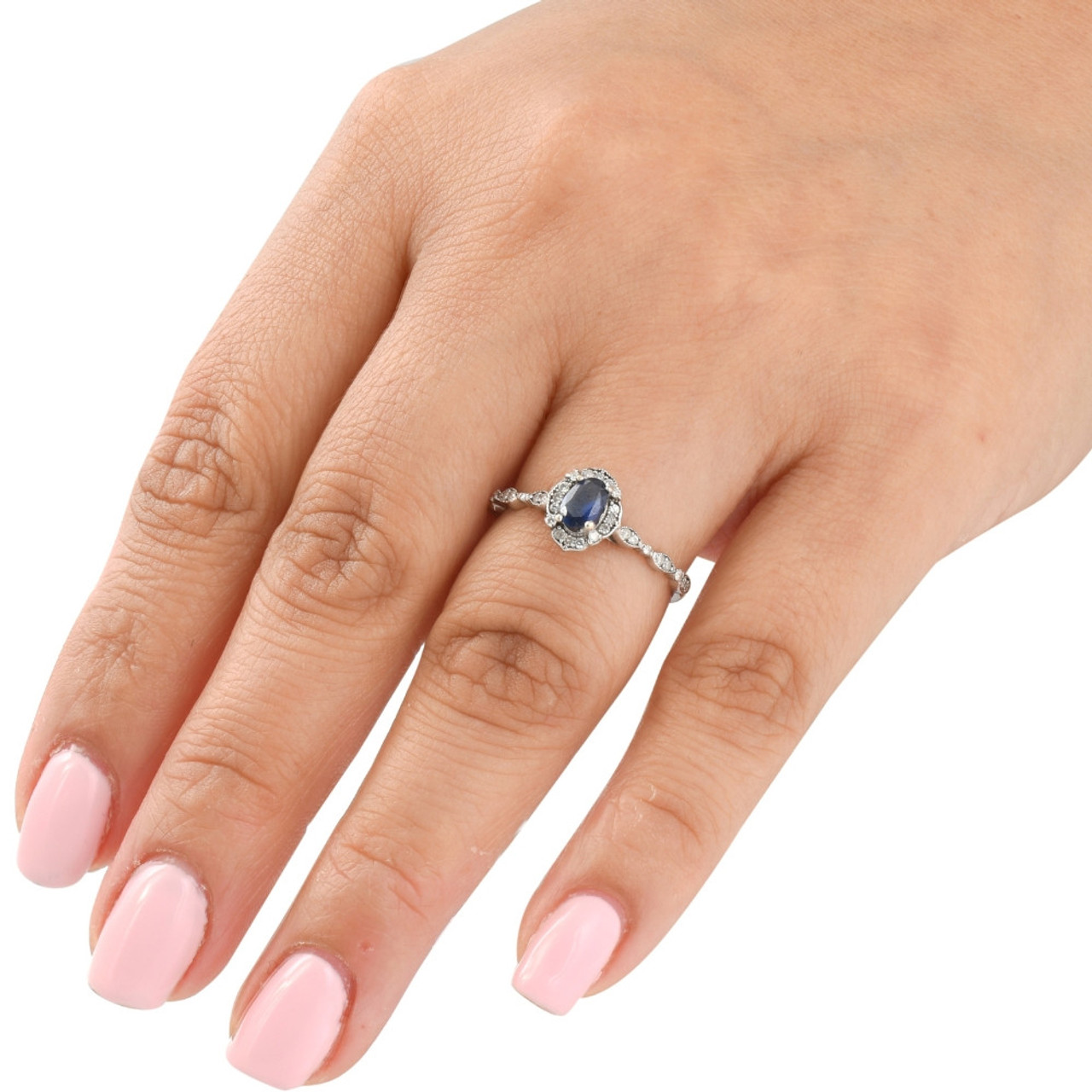 Womens unique and colorful gemstone bridal ring features a 6x4mm oval genuine blue sapphire. The ring is flanked with 32 round cut genuine diamonds. The diamonds are prong set in solid 14k white gold. The setting has vintage milgrain accents throughout.