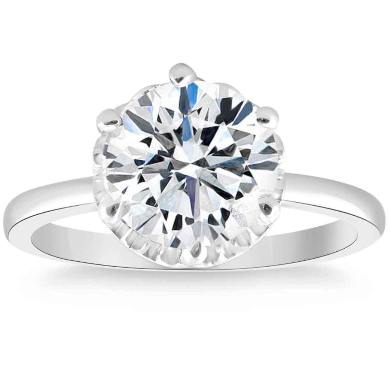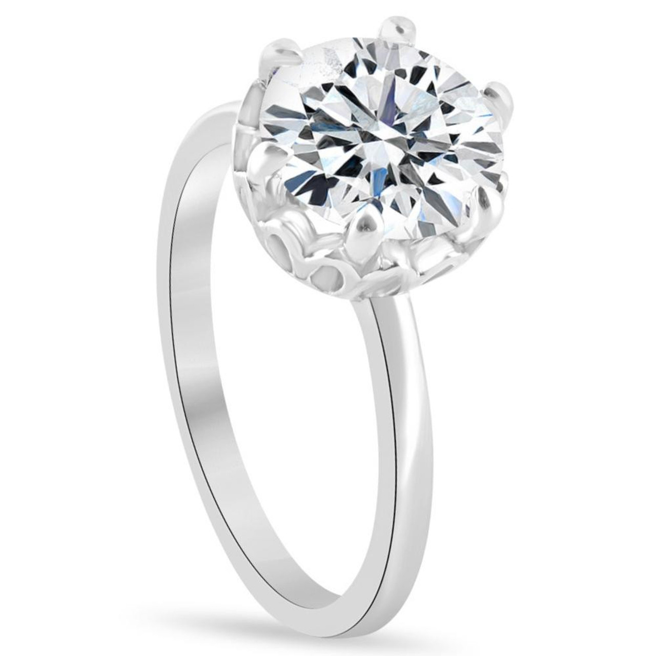 This classic and stunning women's ring features a 3ct round brilliant cut genuine lab grown diamond. The diamond is prong set in a unique basket organic setting. The sparkle center stone is accented with a plain dome high polished band.