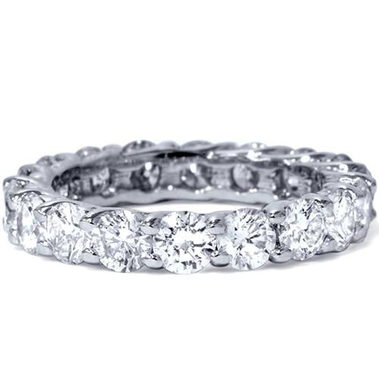 This stunning round brilliant cut natural diamond eternity band features diamonds that encircle the entire ring. All diamonds are securely prong set in 14k white gold. 3ct total diamond weight for all finger sizes.