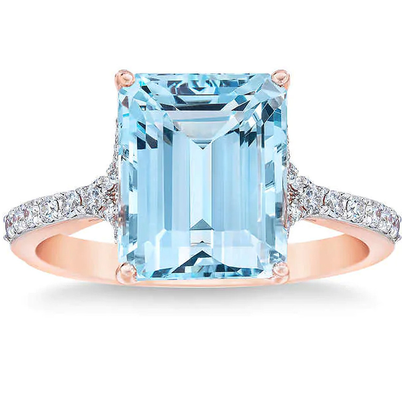 Stunning women's ring features a 11x9mm created aquamarine and round cut accent diamonds. All stones are prong set in solid 14k rose gold.