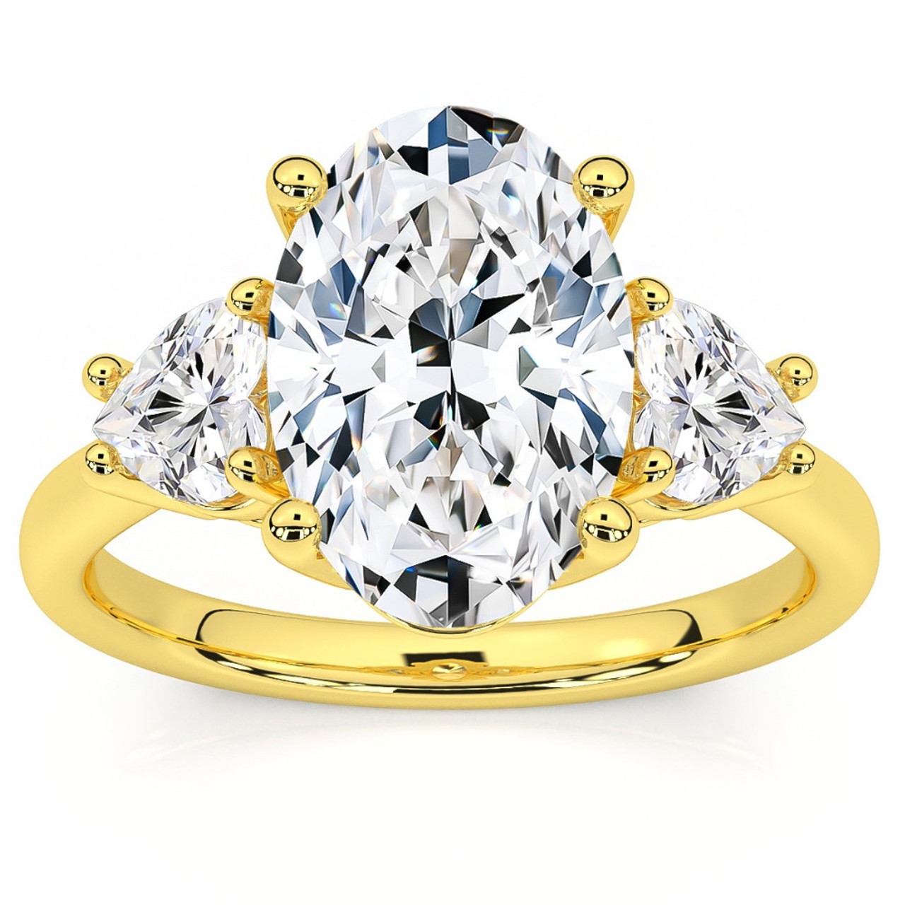 This stunning and classic women's engagement ring features a certified 2ct oval brilliant cut lab grown diamond and two heart shape lab grown diamonds. All three diamonds are prong set in solid 14k gold polished mounting.