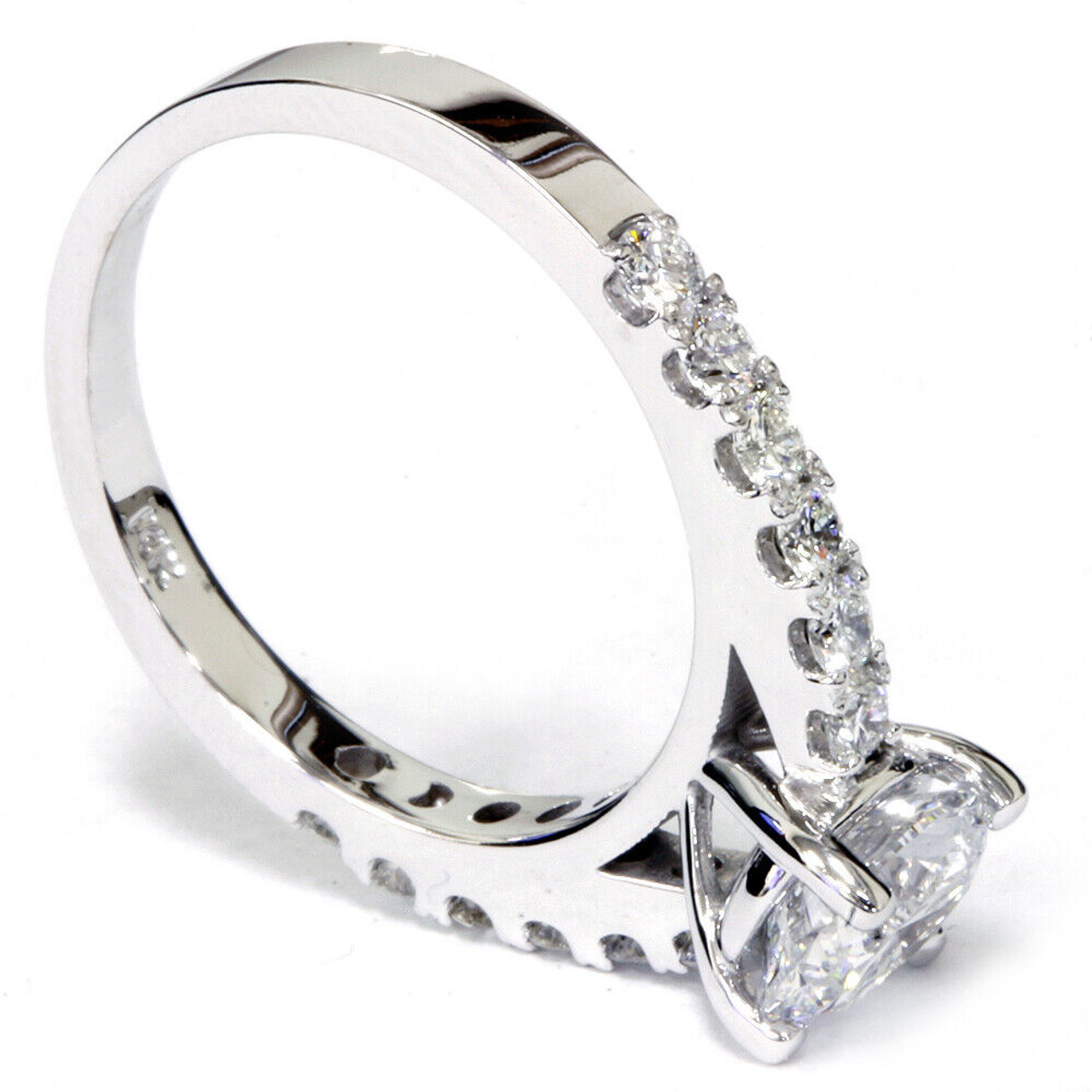 Womens ring features a 1 1/2ct lab grown diamond and 12 round cut accent diamonds. All diamonds are set in solid 14k white gold.
