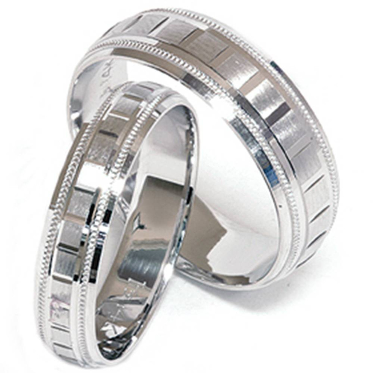This fancy mens and ladies wedding band set features a matching 7 / 4mm band. Both rings are made of solid 14k white gold